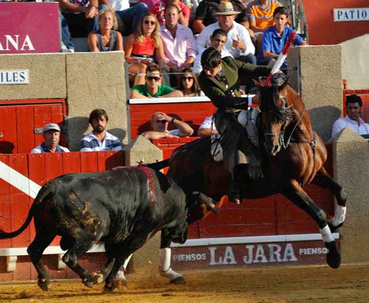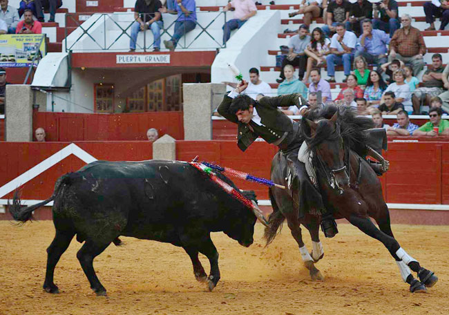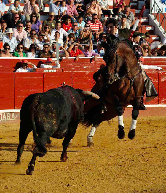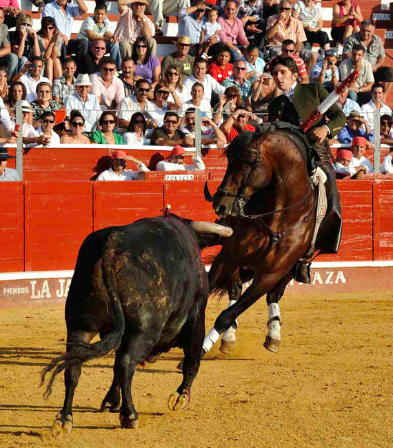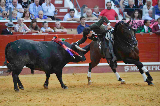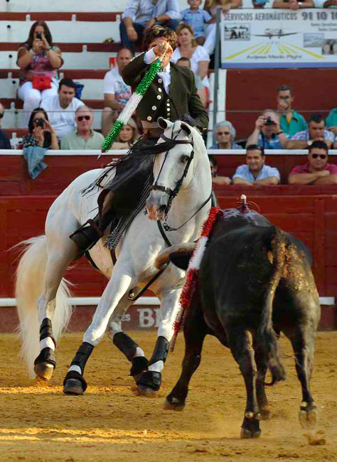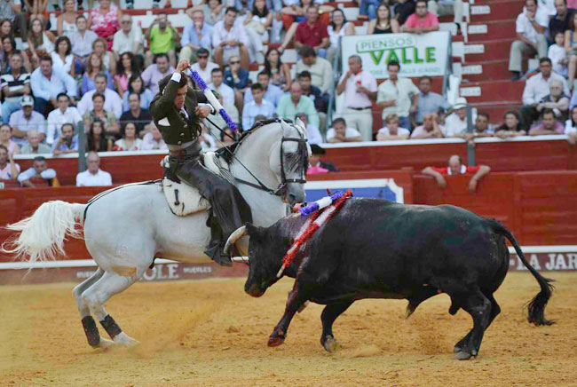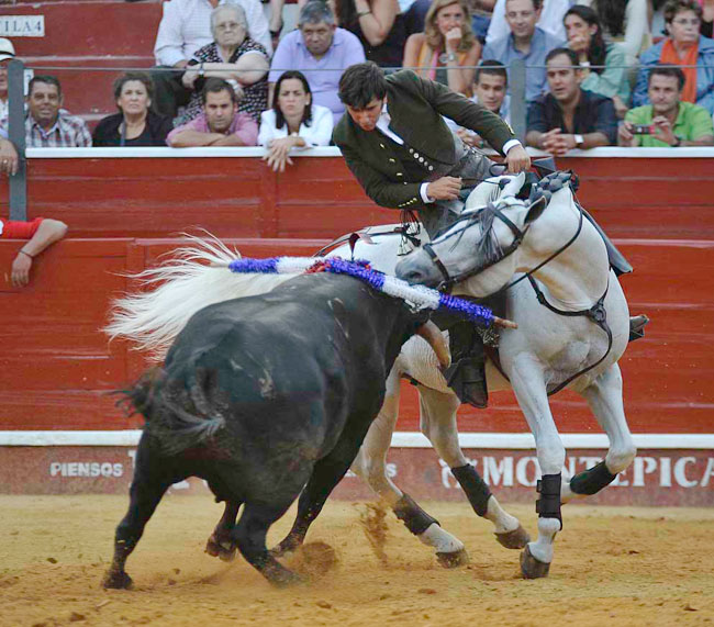 A su primer toro, un animal distraído, lo paró con Maletilla toreándolo muy bien con la grupa y clavando un rejón en los medios yendo de frente, adornándose con dos piruetas en la cara de salida. Con Nazarí hizo las delicias del público galopando de costado a ambas manos. Clavó dos palos de frente con clase, pureza y temple.