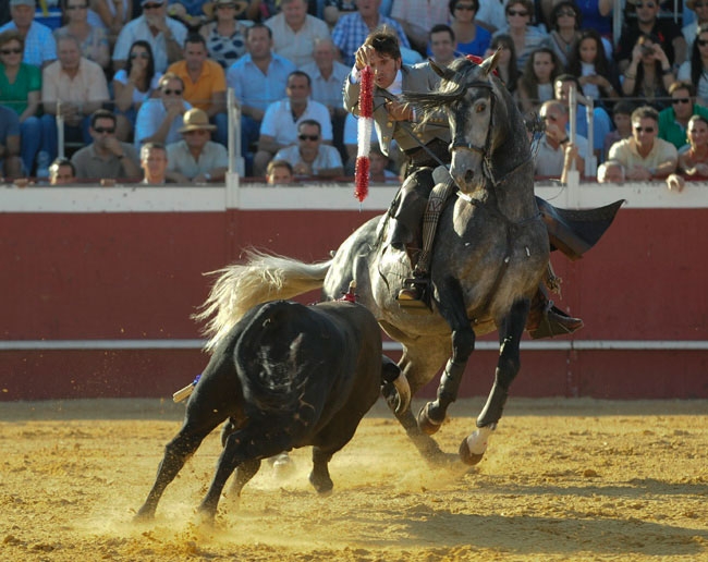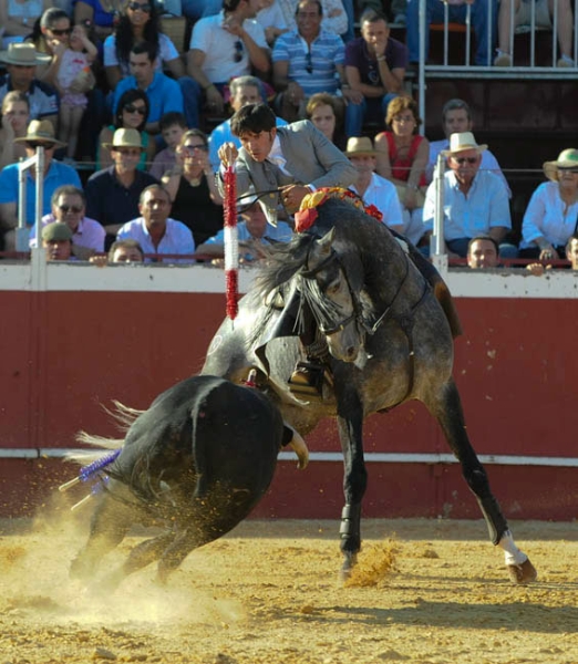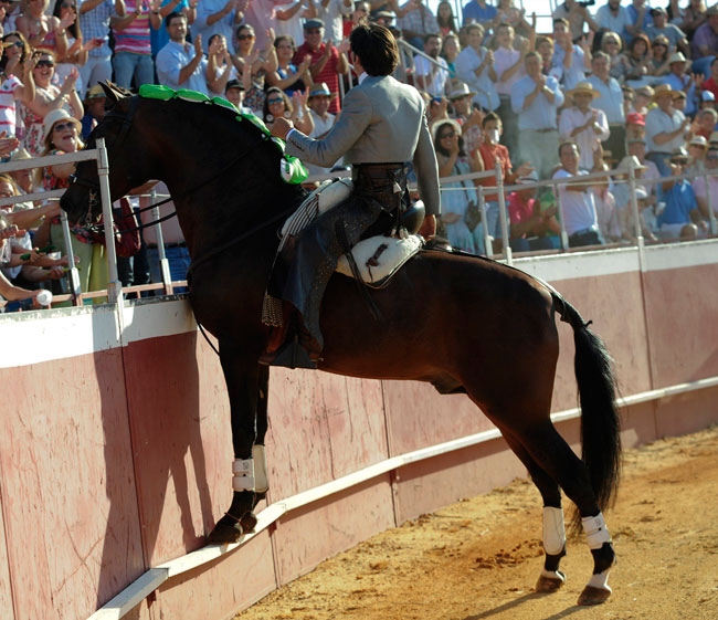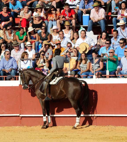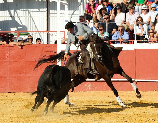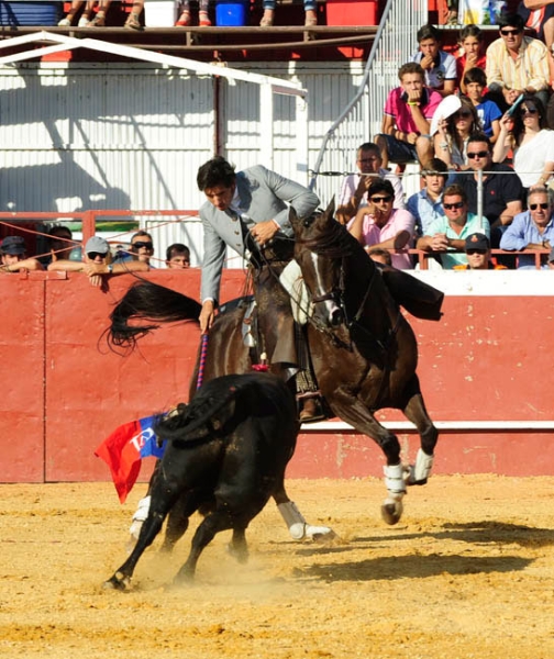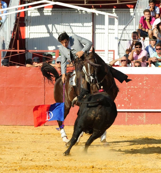 Pegaso tuvo una tarde magnífica, colocando tres banderillas diferentes, pero todas con una gran calidad y ajuste. La primera de ellas la puso andando hacia atrás, como hacía con Distinto, cautivando al tendido. La segunda fue de poder a poder y en la tercera quebró de forma espectacular. Cerró con Califa poniendo tres cortas muy ligadas y mató de pinchazo y rejonazo, cortando dos orejas.