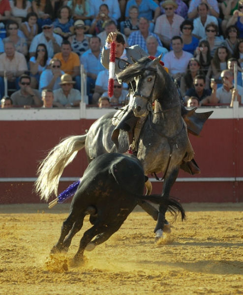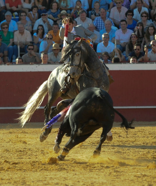 En banderillas comenzó con Conquistador colocando dos palos de frente, adornándose después con piruetas y toreando muy bien de costado. A continuación sacó a Galán, citando con un vistoso tierra a tierra manteniendo siempre al toro en el centro del ruedo. Colocó dos banderillas muy buenas con este caballo.